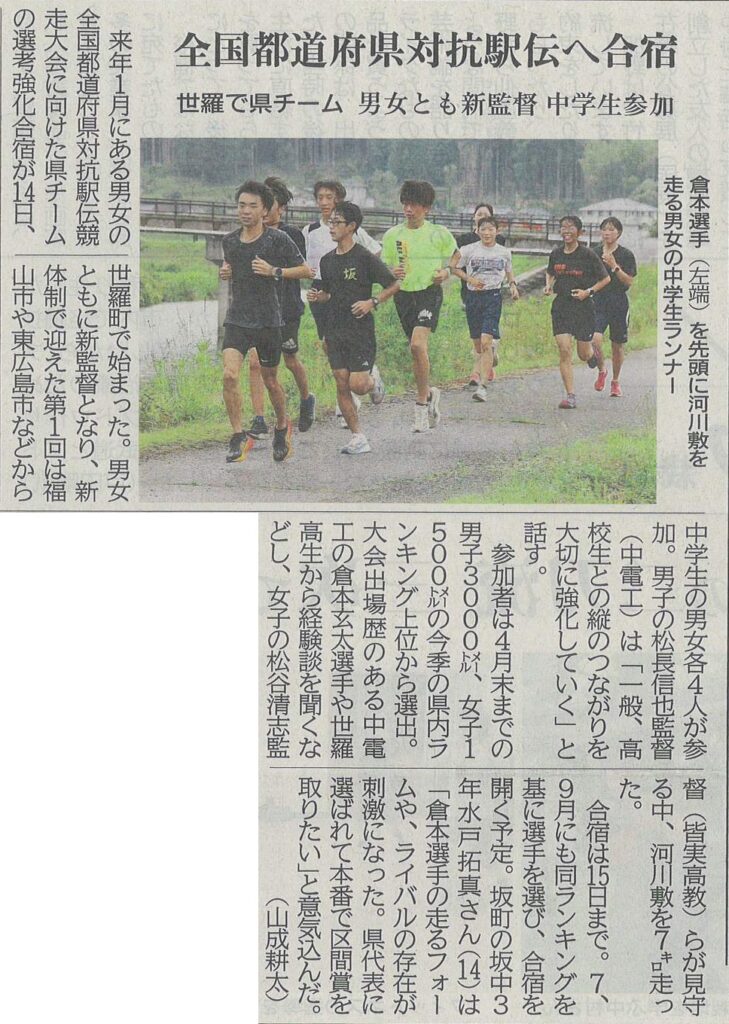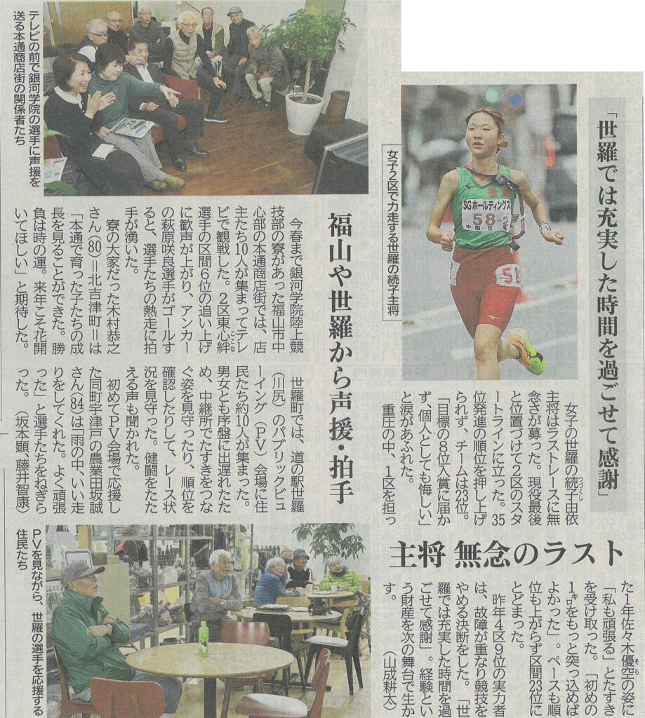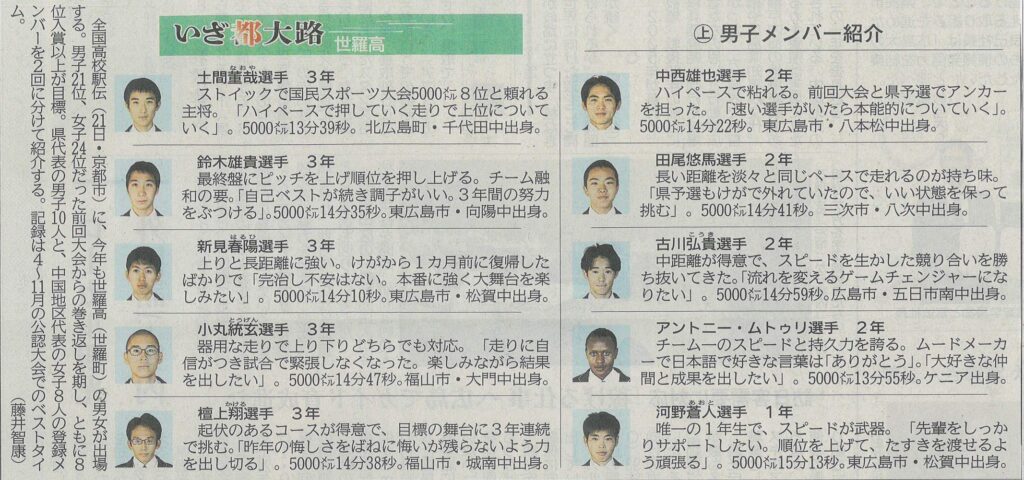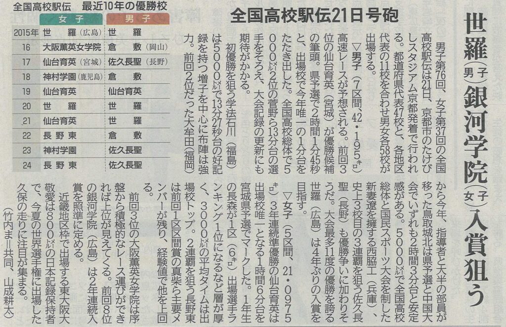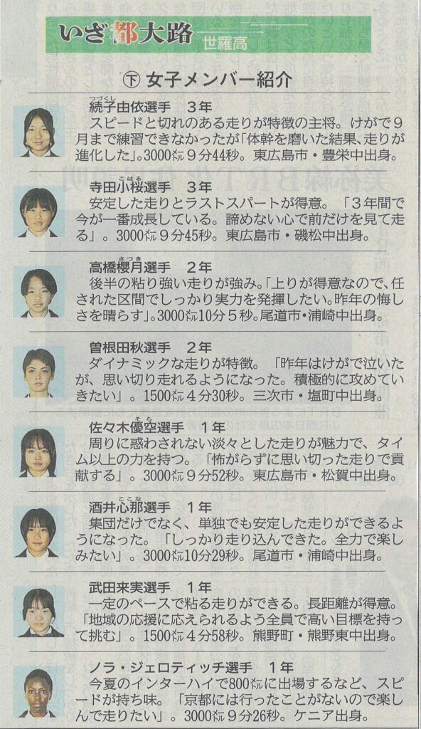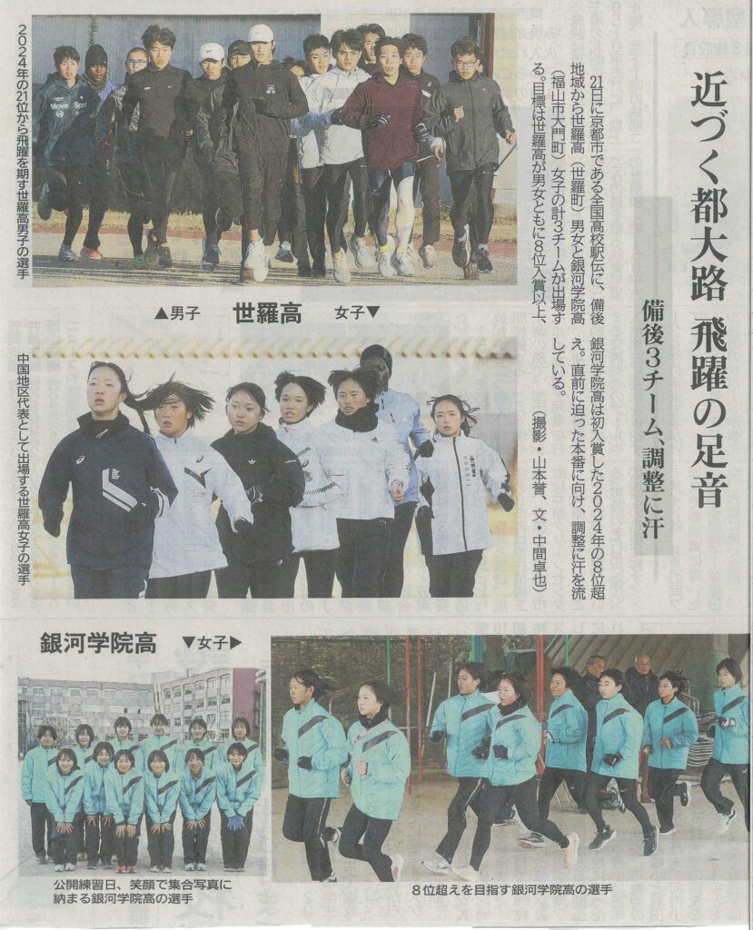 21日に京都市である全国高校駅伝に、備後地域から世羅高(世羅町)男女と銀河学院高(福山市大門町)女子の計3チームが出場します。