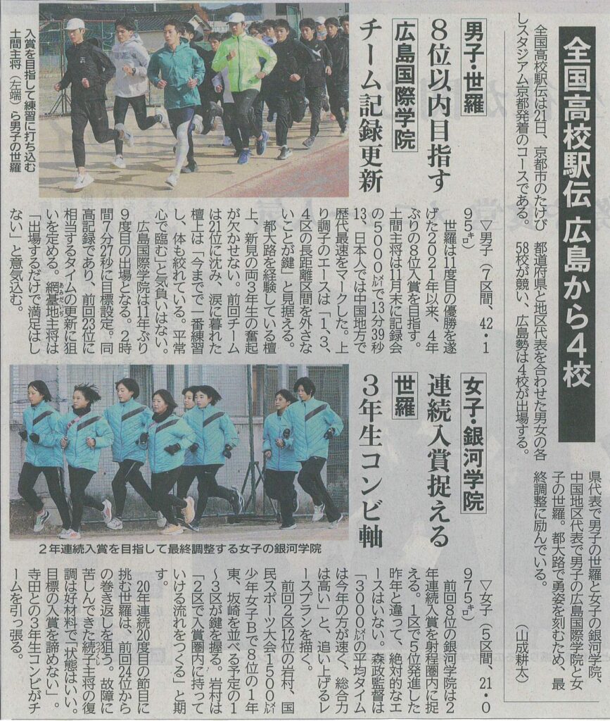 都道府県と地区代表を合わせた男女の各58校が競い、広島勢は4校が出場します。県代表で男子の世羅と女子の銀河学院、中国地区代表で男子の広島国際学院と女子の世羅が出場します。都大路で勇姿を刻むため、最終調整に励んでいます。