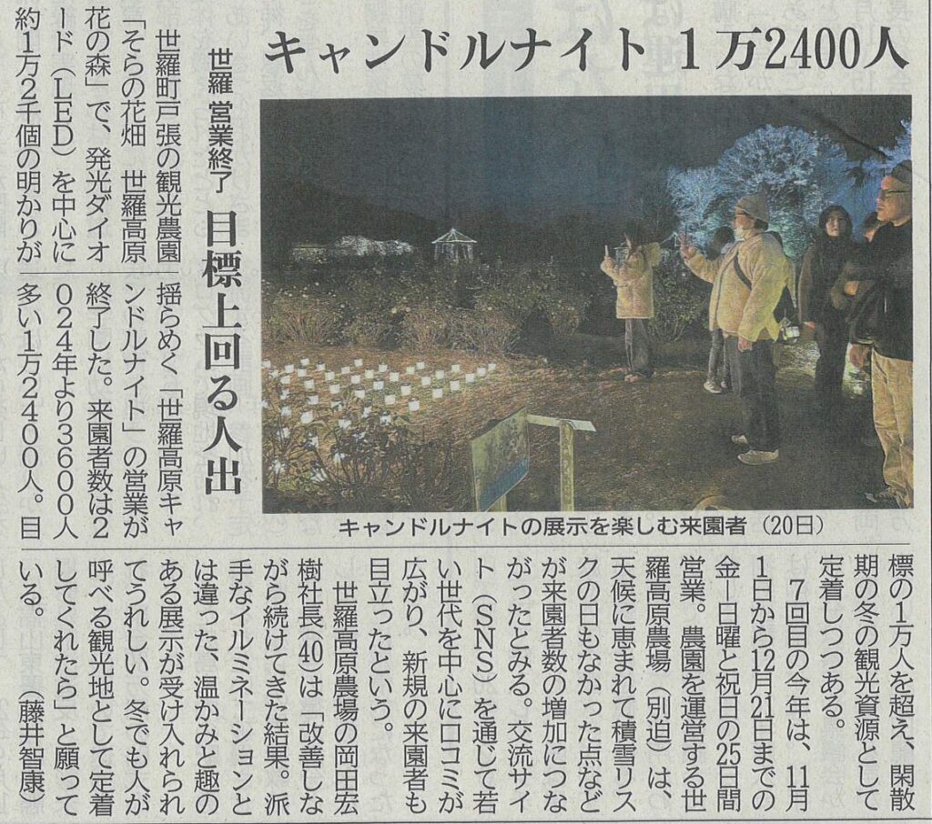 世羅町戸張の観光農園「そらの花畑 世羅高原花の森」で、発光ダイオード(LED)を中心に約1万2千個の明かりが揺らめく「世羅高原キャンドルナイト」の営業が終了しました。来園者数は2024年より3600人多い1万2400人でした。