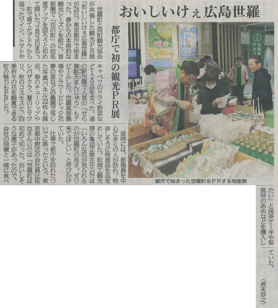 世羅町と同町観光協会が共催した観光PR展「おいしいけぇ広島世羅」が28日、東京都庁で始まりました。春からの本格的な観光シーズンを前に、首都圏で「花の町」の知名度アップを図ろうと初めて開きました。2月3日まで開催されます。