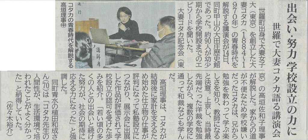 大田庄歴史館で14日、大妻女子創立者大妻コタカさんの講演会が行われ、約90人がコタカさんの出会いと努力のエピソードを聞きました。
