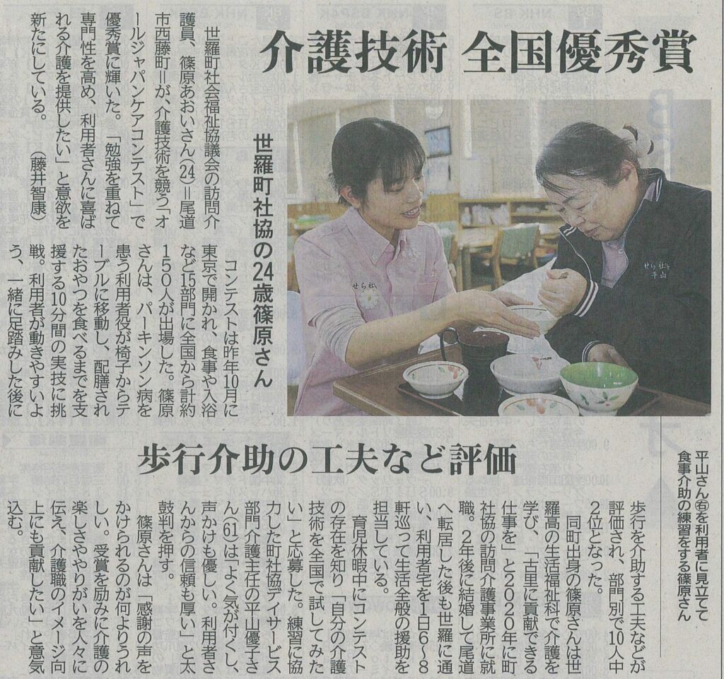 世羅町社会福祉協議会の訪問介護員、篠原あおいさん(24)=尾道市西藤町=が、介護技術を競う「オールジャパンケアコンテスト」で優秀賞に輝きました。「勉強を重ねて専門性を高め、利用者さんに喜ばれる介護を提供したい」と意欲を新たにしています。
