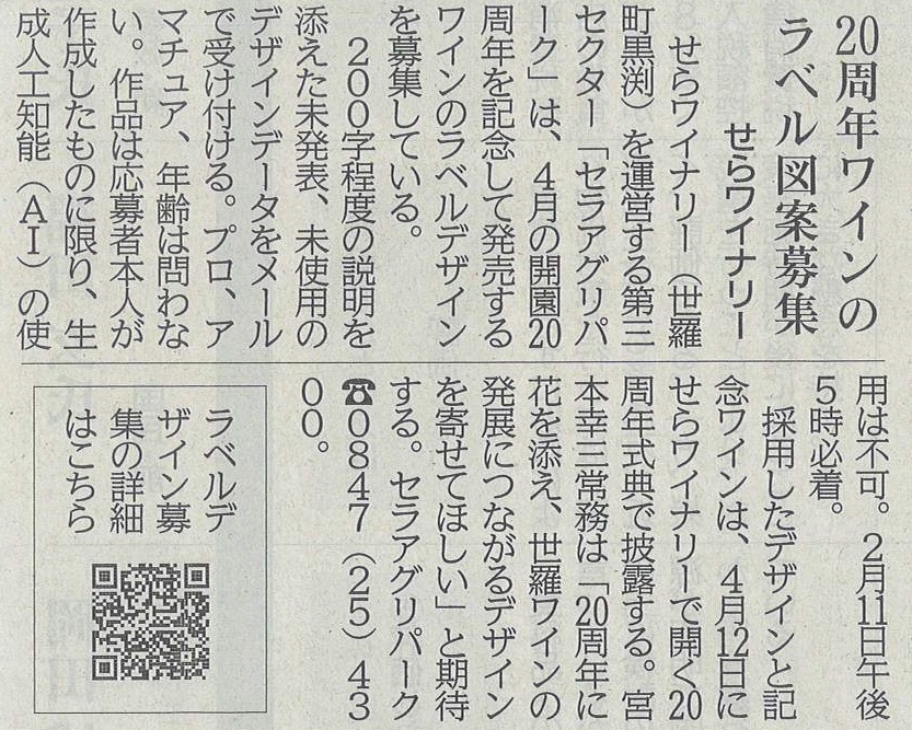 せらワイナリーを運営する第三セクター「セラアグリパーク」は、4月の開園20周年を記念して発売するワインのラベルデザインを募集しています。