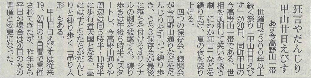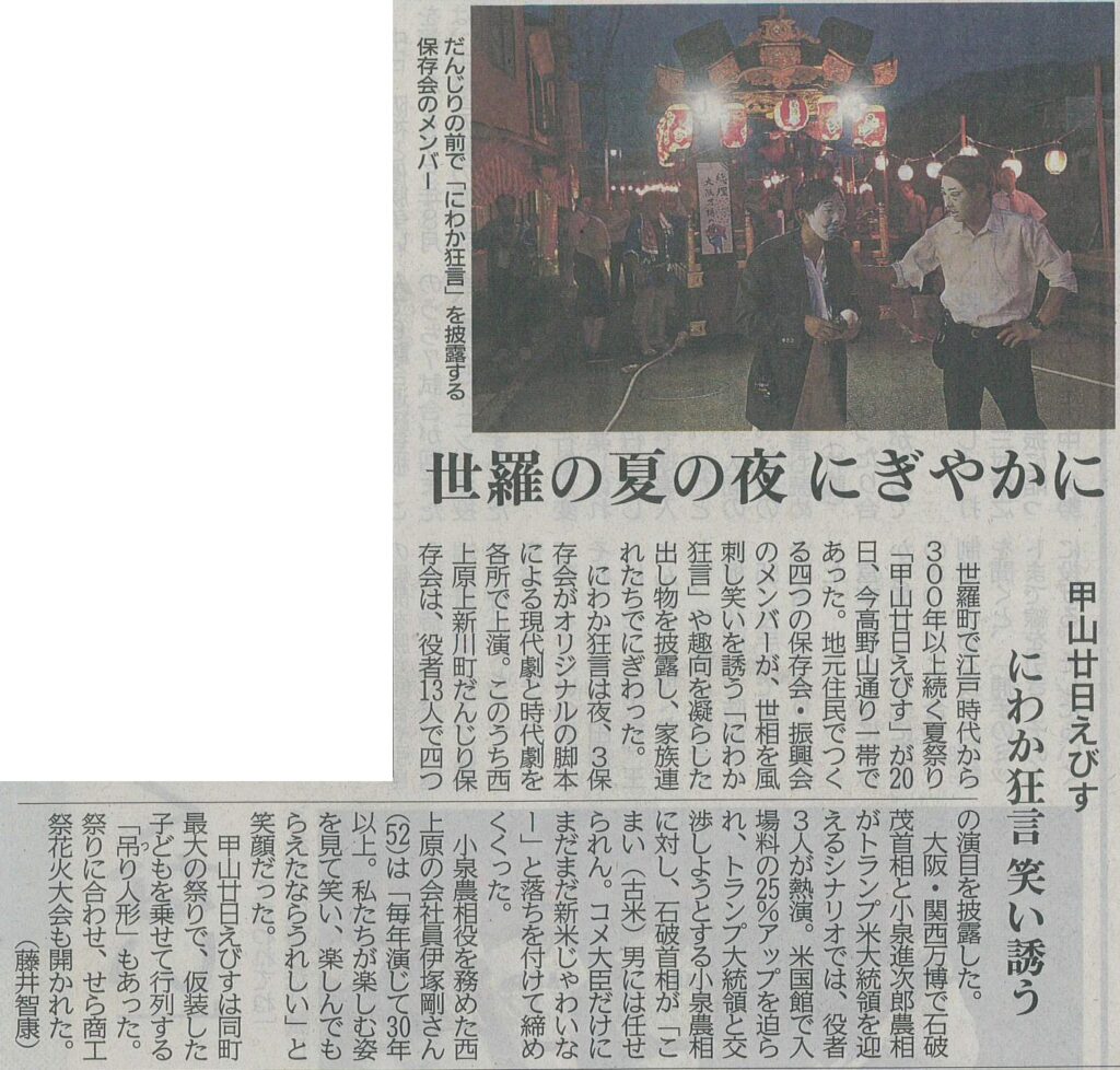 世羅町で江戸時代から300年以上続く夏祭り「甲山廿日えびす」が20日、今高野山通り一帯でありました。地元住民でつくる四つの保存会・振興会のメンバーが、世相を風刺し笑いを誘う「にわか狂言」や趣向を凝らした出し物を披露し、家族連れたちでにぎわいました。