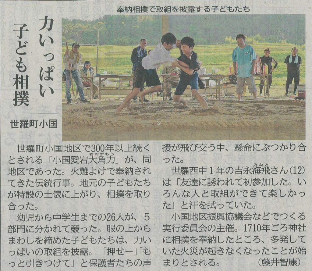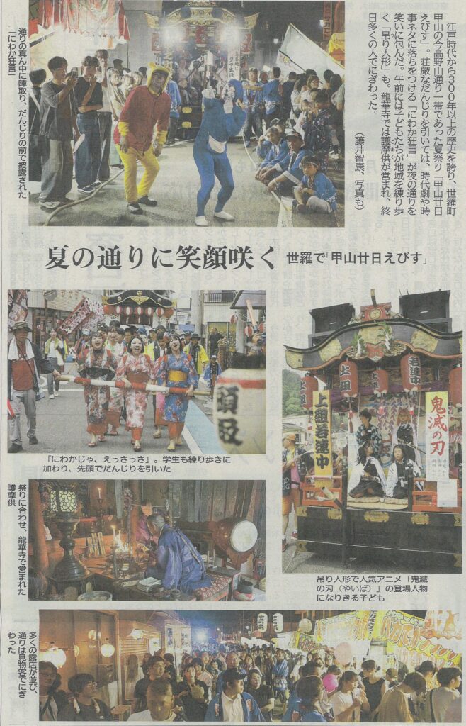 江戸時代から300年以上の歴史を誇り、世羅町甲山の今高野山一帯であった夏祭り「甲山廿日えびす」。荘厳なだんじりを引いては、時代劇や時事ネタに落ちをつける「にわか狂言」が夜の通りを笑いに包みました。午前には子どもたちが地域を練り歩く「吊り人形」も。龍華寺では護摩供が営まれ、終日多くの人でにぎわいました。