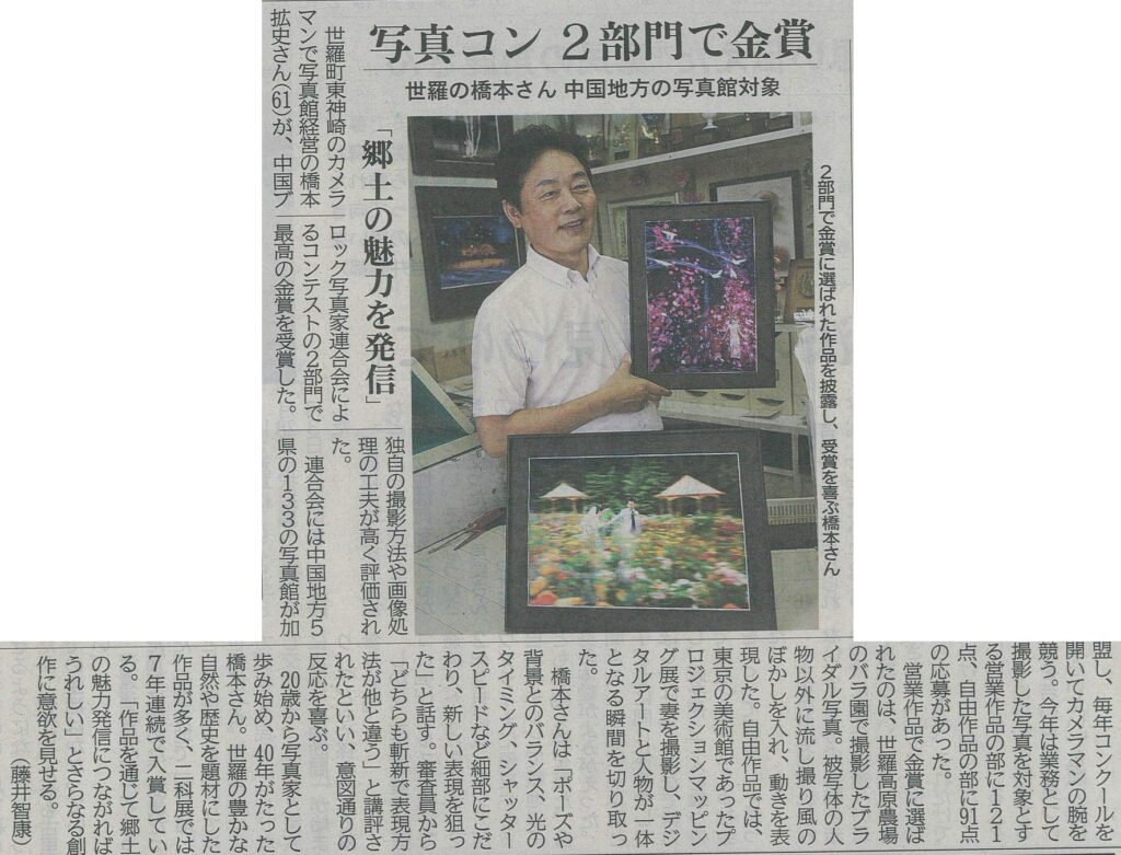 世羅町東神崎のカメラマンで写真館経営の橋本拡史さん(61)が、中国ブロック写真家連合会によるコンテストの2部門で最高の金賞を受賞しました。独自の撮影方法や画像処理の工夫が高く評価されました。