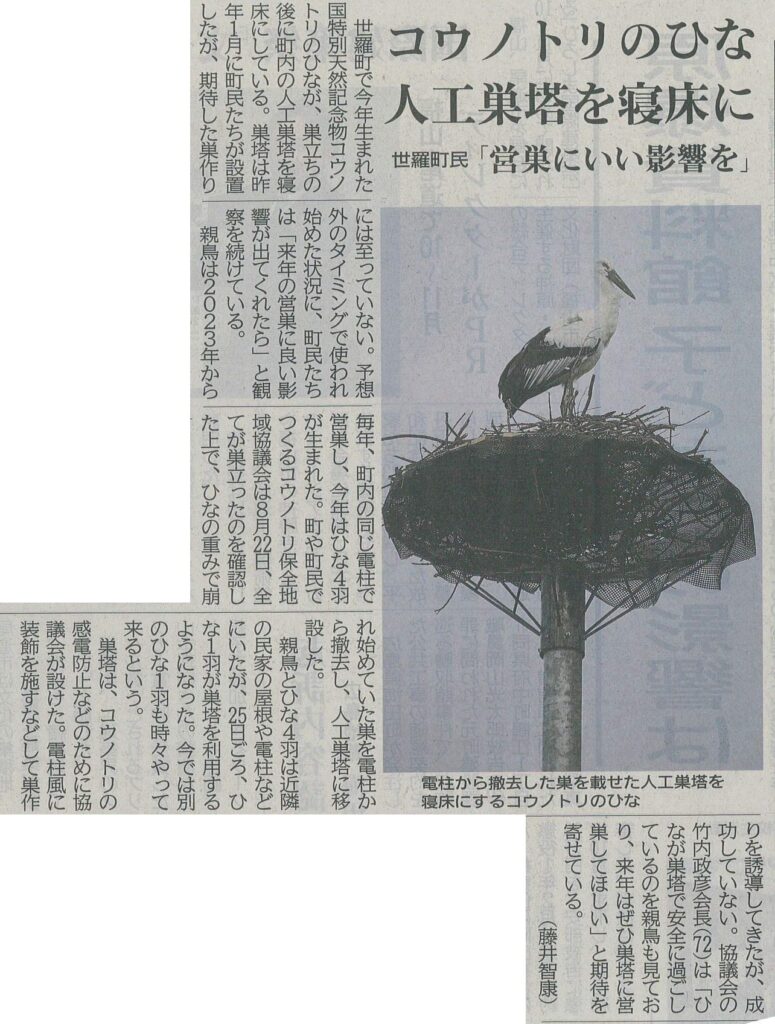 世羅町で今年生まれた国特別天然記念物コウノトリのひなが、巣立ちの後に町内の人工巣塔を寝床にしています。巣塔は昨年1月に町民たちが設置しましたが、期待した巣作りには至っていません。予想外のタイミングで使われ始めた状況に、町民たちは「来年の営巣に良い影響が出てくれたら」と観察を続けています。