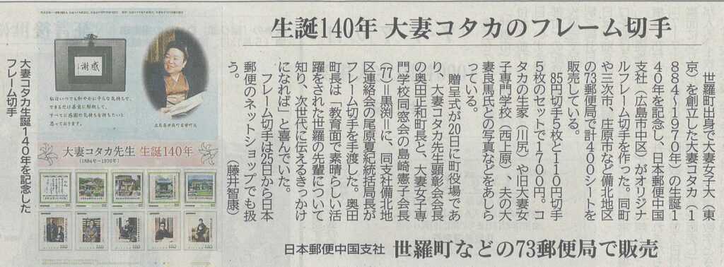 世羅町出身で大妻女子大学設立者の大妻コタカの生誕140年を記念して、オリジナルフレーム切手が登場しました。20日には世羅町役場で贈呈式も行われました。