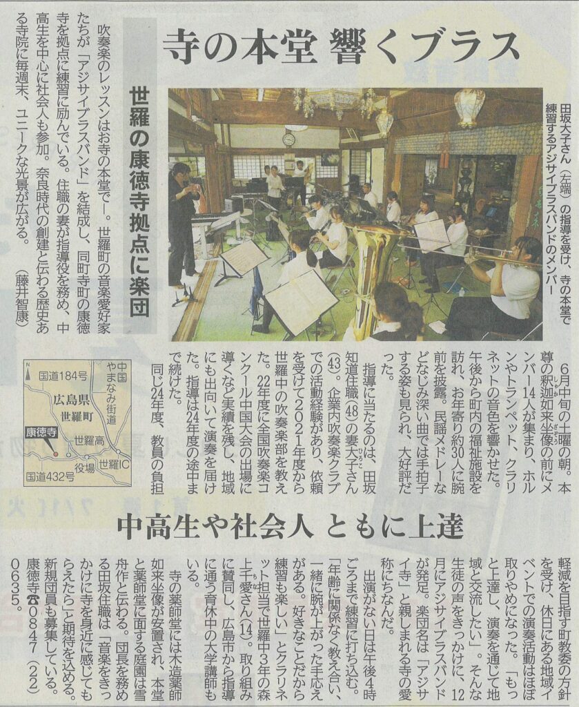 康徳寺を拠点に活動する「アジサイブラスバンド」が紹介されました。田坂住職の妻大子さんが指導にあたり、メンバー14人で活動中です。新規団員も募集中です。