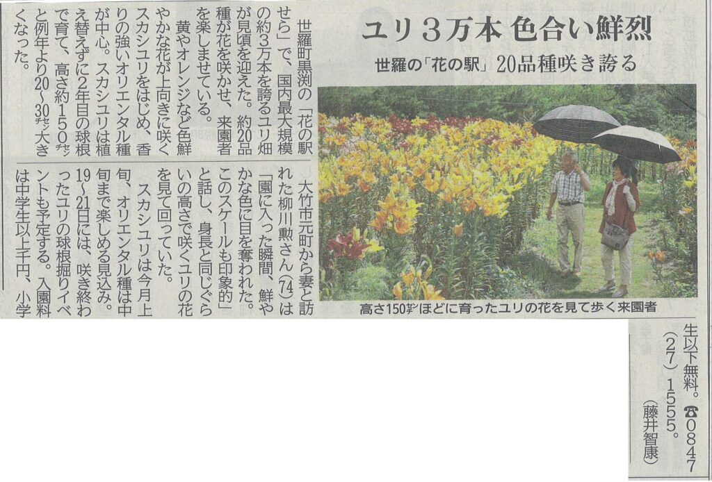 花の駅せらで国内最大規模の20品種3万本のゆり畑が見頃を迎えました。スカシユリは7月上旬、オリエンタル種は中旬まで楽しめる予定です。