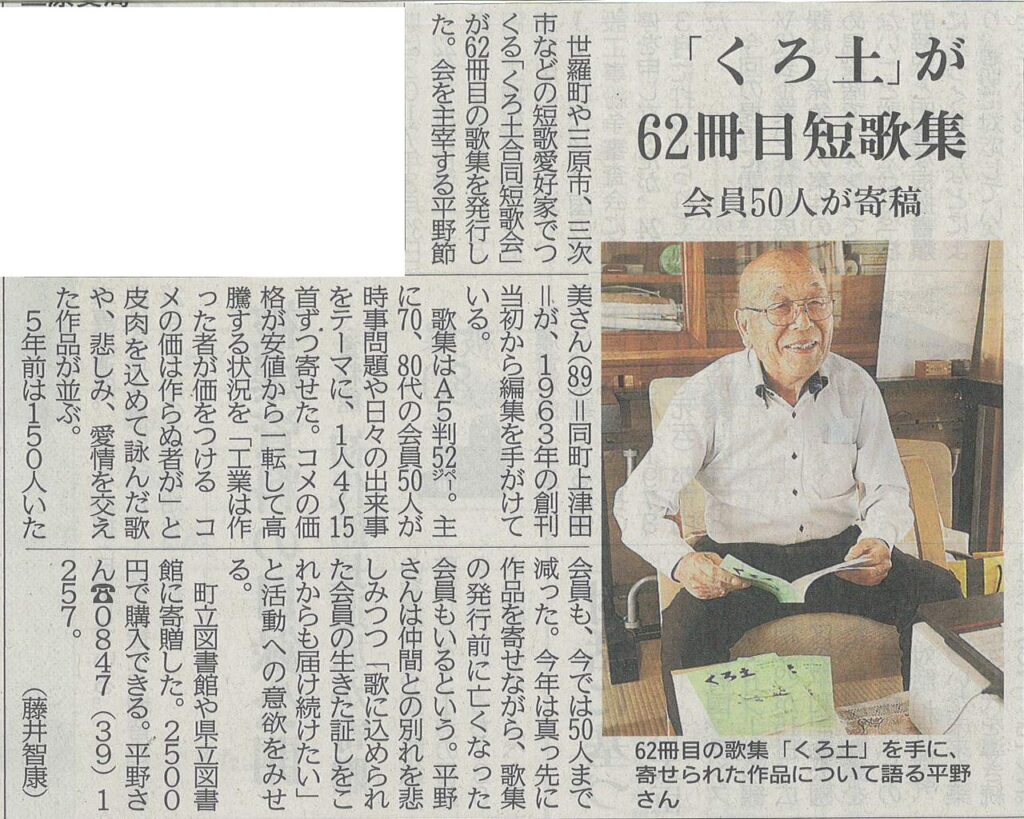 世羅町や三次市などの短歌愛好家でつくる「くろ土合同短歌会」が62冊目の歌集を発行し、会員50人が時事問題や日々の出来事を寄せました。1冊2,500円で購入いただけます。