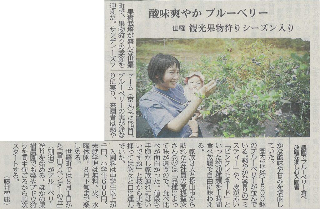 サンディーズファームでブルーベリーの摘み取りが最盛期を迎えています。1時間食べ放題中学生以上1,000円、小学生600円、未就学児は無料。8月下旬ごろまで楽しめます。