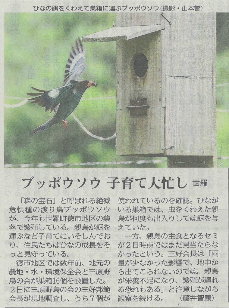 「森の宝石」と呼ばれる絶滅危惧種の渡り鳥ブッポウソウが、今年も世羅町徳市地区の集落で繁殖しています。親鳥が餌を運ぶなど子育てにいそしんでいて、住民たちはひなの成長をそっと見守っています。