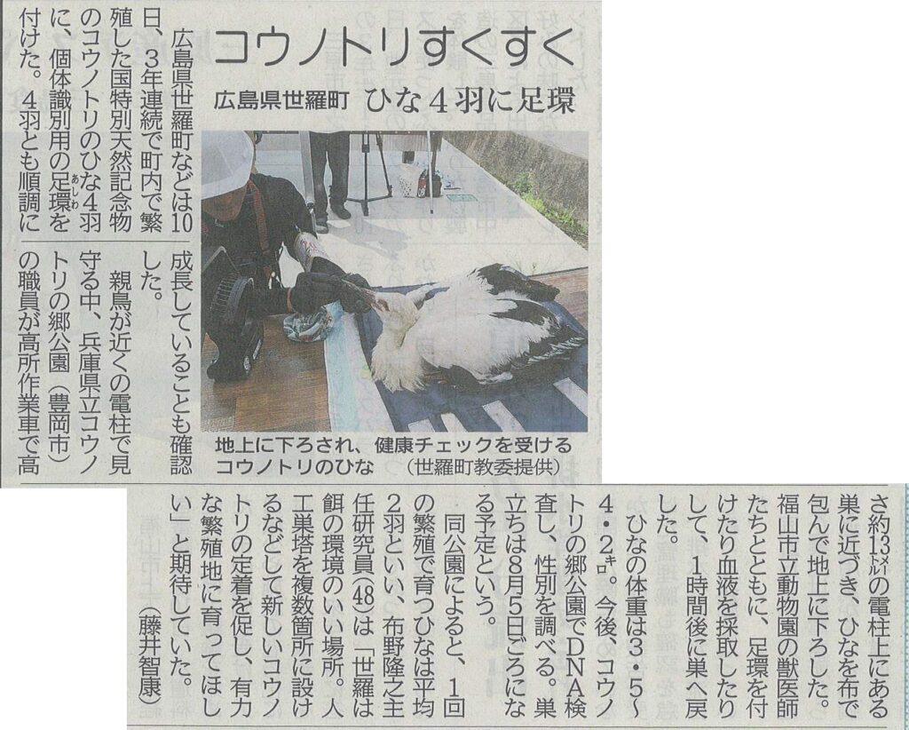 広島県世羅町などは10日、3年連続で町内で繁殖した国特別天然記念物のコウノトリのひな4羽に、個体識別用の足環を付けました。4羽とも順調に成長していることも確認しました。