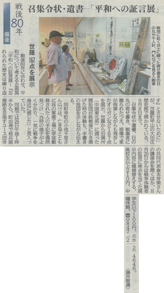 戦後80年に合わせ、平和について考える企画展「平和への証言展~『忘れられた歴史は繰り返す』とさせないために」が、世羅町甲山の大田庄歴史館で9月8日まで開かれています。