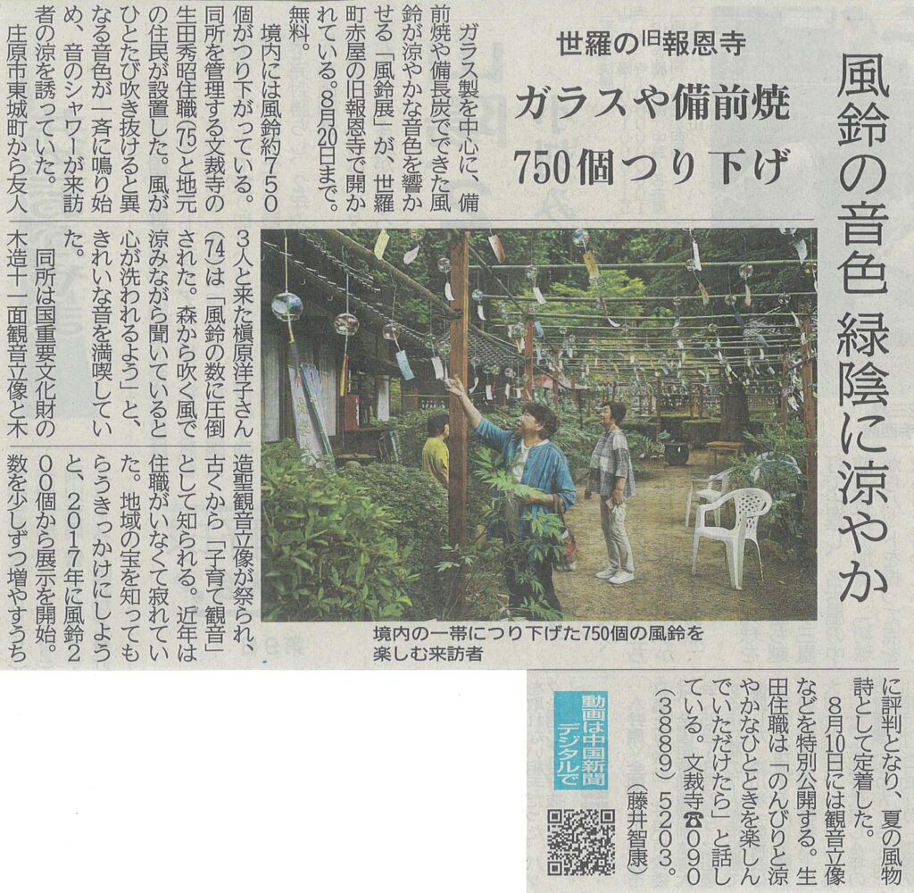 ガラス製を中心に、備前焼や備長炭でできた風鈴が涼やかな音色を響かせる「風鈴展」が、背r長赤屋の旧報恩寺で開かれています。8月20日まで。無料。